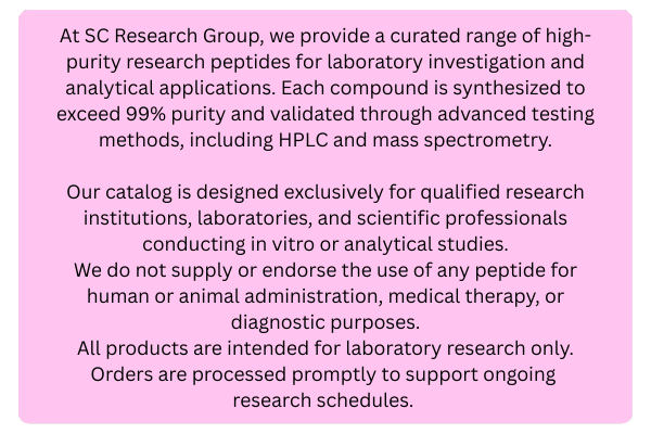 All products are sold in powder (lyophilized) form and require reconstitution with a suitable diluent for research purposes only. No dosing instructions are provided. We adhere to all local and state laws around Research Only Chemical sales. We are not a pharmacy, nor do we promote or provide any advice for human or animal consumption. Please review our terms and conditions carefully before making a purchase on our website. By continuing to this site, you acknowledge that you are 18+ years of age.